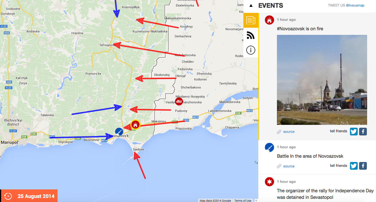 Het zou gaan om een konvooi van Russische tanks die de vlag voeren van de Volksrepubliek Donetsk. Die zouden op weg zijn naar Telmanove en Amvrosiivka, mogelijk met als einddoel de kuststad Marioepol. Een broodfabriek in Novoazovsk zou met granaten beschoten worden.