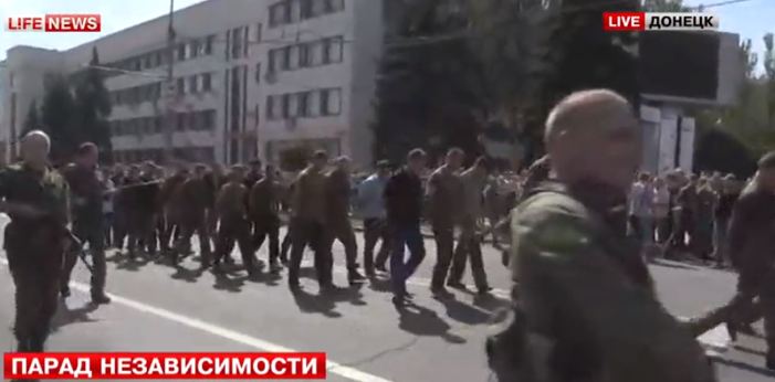 De pro-Russische rebellen hebben in de stad Donetsk hun eigen parade gehouden. Daarbij liepen, zoals al was aangekondigd, gevangen genomen Oekraïense militairen mee, tot groot vermaak van de toeschouwers. Die riepen 'fascisten!' en 'moordenaars!' naar de soldaten.