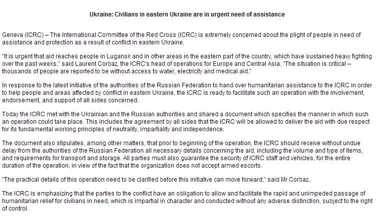'Na het recente voorstel van de autoriteiten in de Russische Federatie om hulpgoederen aan het Internationale Rode Kruis over te dragen om de mensen in de door het conflict getroffen oosten van Oekraïne heeft het IRCR besloten zo'n operatie op te zetten met steun en betrokkenheid van alle partijen', gaat de verklaring verder.